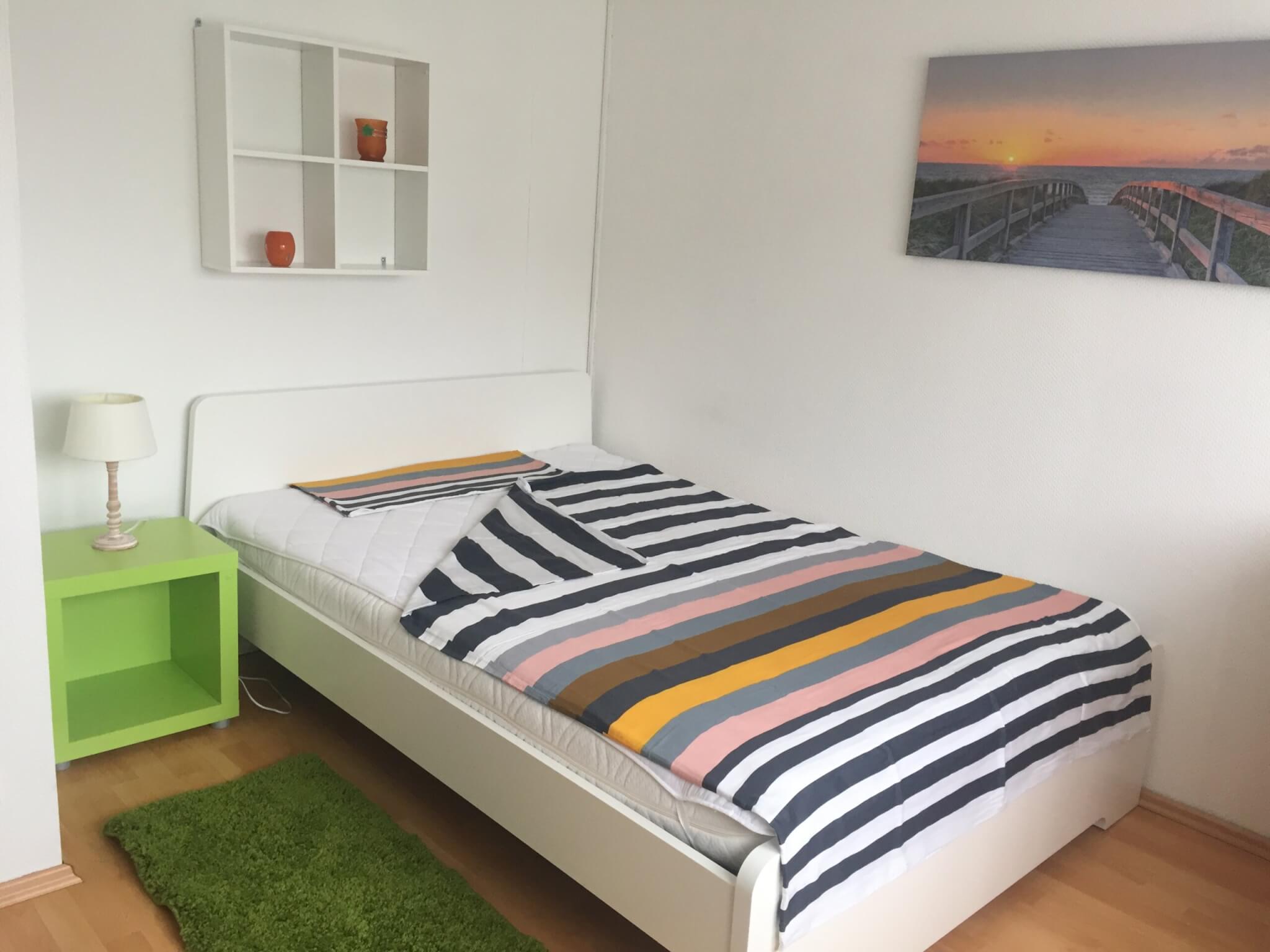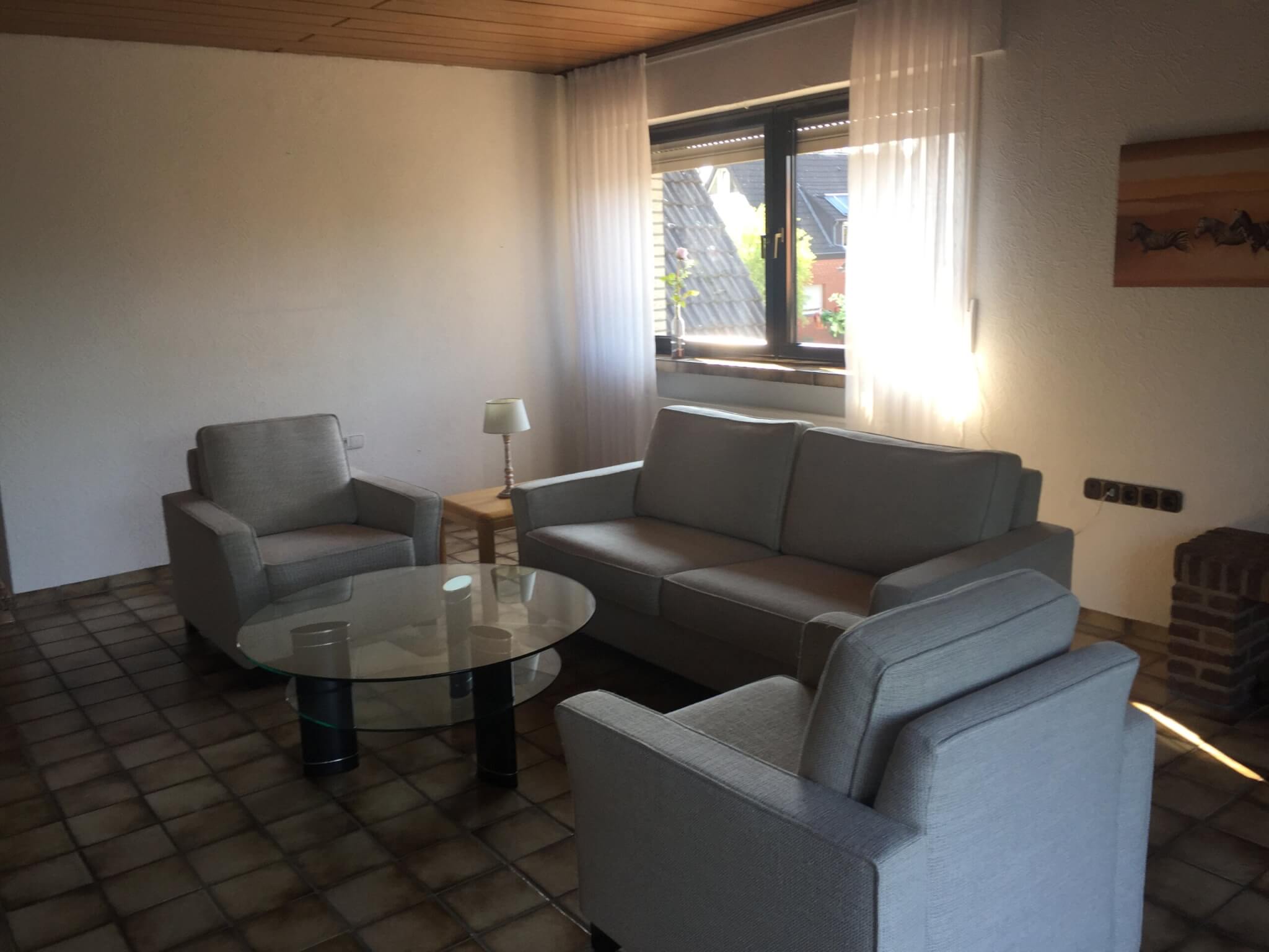Die Wohnung ist 95 qm groß. Wohnzimmer, Küche, Bad, Gäste-WC, Abstellraum und Balkon werden gemeinsam genutzt. Zur Ausstattung gehören sämtliche Möbel sowie alle Dinge des täglichen Gebrauchs wie Geschirr, Töpfe, Handtücher, Bettzeug, Bettwäsche, Wäscheständer usw. Die Küche ist ausgestattet mit Herd, Backofen, Kühl-Gefrier-Kombination, Spülmaschine, Mikrowelle, Wasserkocher, Toaster, Kaffeemaschine und Küchenutensilien. Eine Waschmaschine ist im Keller vorhanden. Das Haus verfügt über einen Glasfaseranschluss. Das Fahrrad kann in der Garage untergebracht werden, das Auto kann auf einem Parkplatz (50 m entfern) kostenlos abgestellt werden. Vermietung nur an Nichtraucher, es werden keine Haustiere gewünscht.
