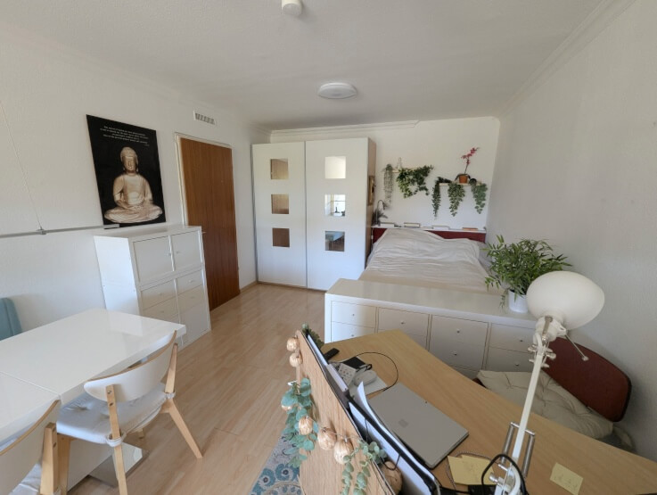 Dein wunderschönes Zimmer im olympischen Dorf ist sehr hell, ca. 30qm groß und hat eine volle Fensterfront mit Balkon (Südausrichtung). Es ist ausgestattet, wie auf den Bildern sichtbar: - Wohnbereich: Couch (ohne TV), Wohnwandregale - Schlafbereich: Bett, Kleiderschrank - Arbeitsbereich: Schreibtisch, Stuhl - Essbereich: ausziehbarer Esstisch mit Sitzbank und Stühlen. In der Warmmiete sind die Kosten für Strom, Wasser, Heizung und WLAN enthalten.   Bitte schreib mir eine Nachricht, in der du dich kurz vorstellst und gib am besten Deine Telefonnummer an, damit ich dich kontaktieren kann.